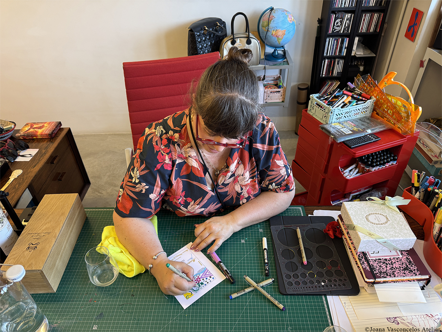 Joana Vasconcelos travaillant sur le dessin « Paraíso » destiné à l’étiquette de Château Mouton Rothschild 2023